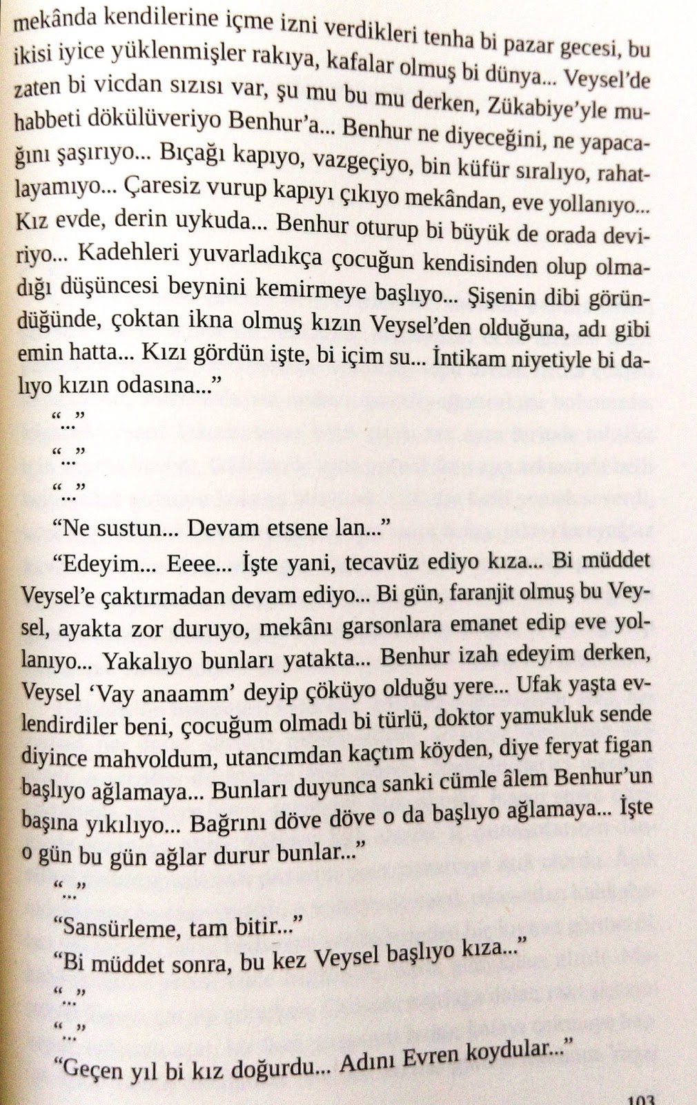 Başta da belirttiğim üzere, bir kitabın böyle bir iddiası varsa, bunu zaten olmakta olan rezil ve korkunç olayları bir kez daha yazarak, ama olduğu gibi yazarak ve üstelik birtakım erkek kahramanların rakı masalarında alttan alta zevk vererek dinledikleri bir dille, rakı masası ağzıyla yazarak eleştiremezsin. Olduğu gibi anlatmaksa dert, anlatırsın; ama bir yerde de küçük bir cümleyle de olsa “Orada dur” dersin. Ama işte bunu yapmadığınızda o kitabı yazmanıza gerek yok; aynısını Şafak Sezer’in filmlerinde de izlersiniz zaten.